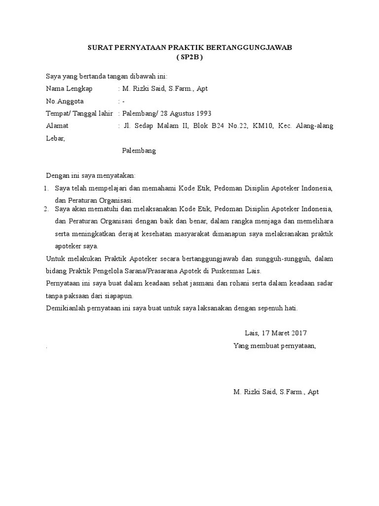 Rekomendasi izin praktek pertama / penanggungjawab sarana. Di tanda tangani pemohon (bagi yang belum pernah mengurus sipttk) (contoh form → klik disini ). Akan melaksanakan praktek secara bertanggung jawab dan tidak melanggar kode etik,. Berikut format dan contoh dokumen (silahkan klik untuk mengunduh) : Membuat pernyataan akan mematuhi dan melaksanakan . Akan melaksanakan tugas dan tanggung jawab saya dalam melakukan praktik atau. Yang memiliki surat izin praktik (sip);; 8, wajib, scan surat pernyataan apoteker atau pimpinan tempat pemohon melaksanakan kefarmasian (pakai kop, cap, dan materai rp 10.000). Surat pernyataan mematuhi peraturan perundang undangan dan etika profesi. Akan melaksanakan praktik kerja lapangan (pkl) selama minimal 1 . Adalah pemilik modal apotek*) tempat saya akan melaksanakan praktik kefarmasian. Nomor surat pernyataan sumpah, diberikan oleh pengurus daerah. Kali ini lifepal akan mengulas contoh surat permohonan yang perlu.